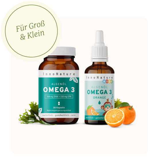 Weil eine gute Omega-3-Versorgung nicht selbstverständlich ist. Kapseln für Dich, Tropfen für die Kids. Aus hochwertigem Algenöl, liefert das Set DHA und EPA für Gehirn, Sehkraft und Wohlbefinden – natürlich und 100 % vegan.