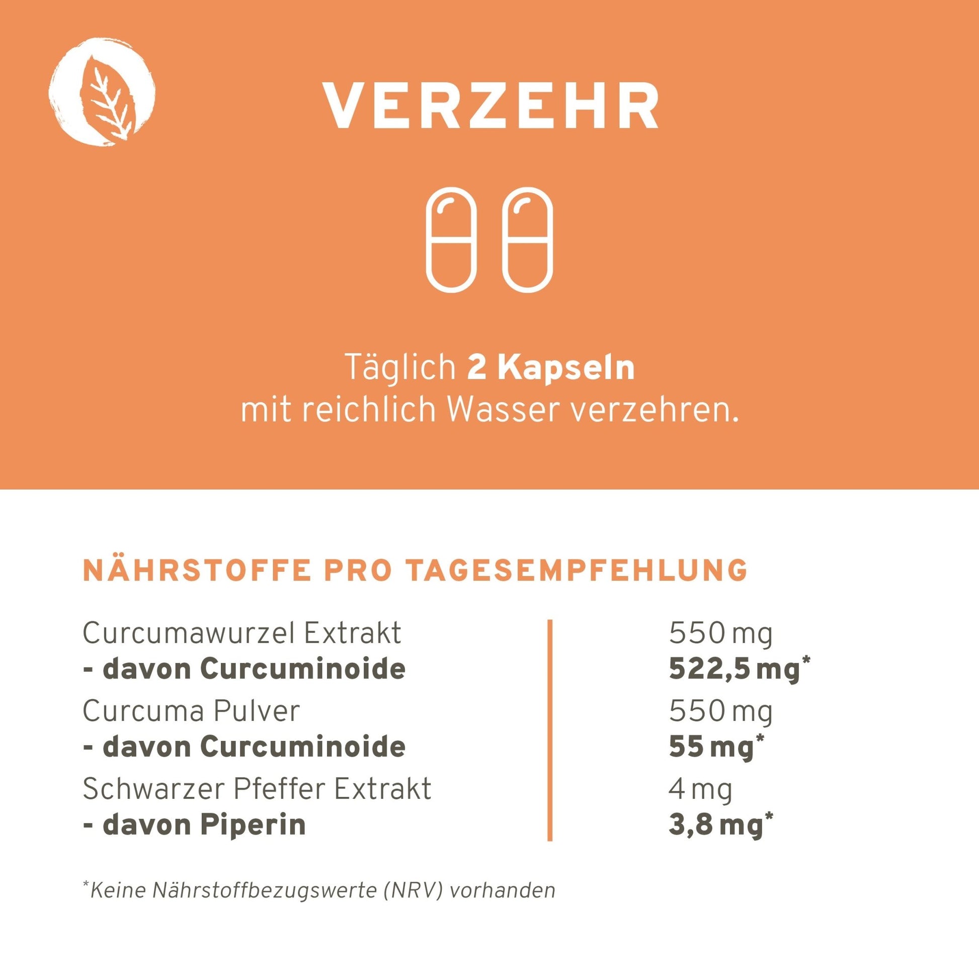 Die empfohlene Tagesdosis von zwei Curcuma Kapseln enthält 550 mg Curcuminoide.