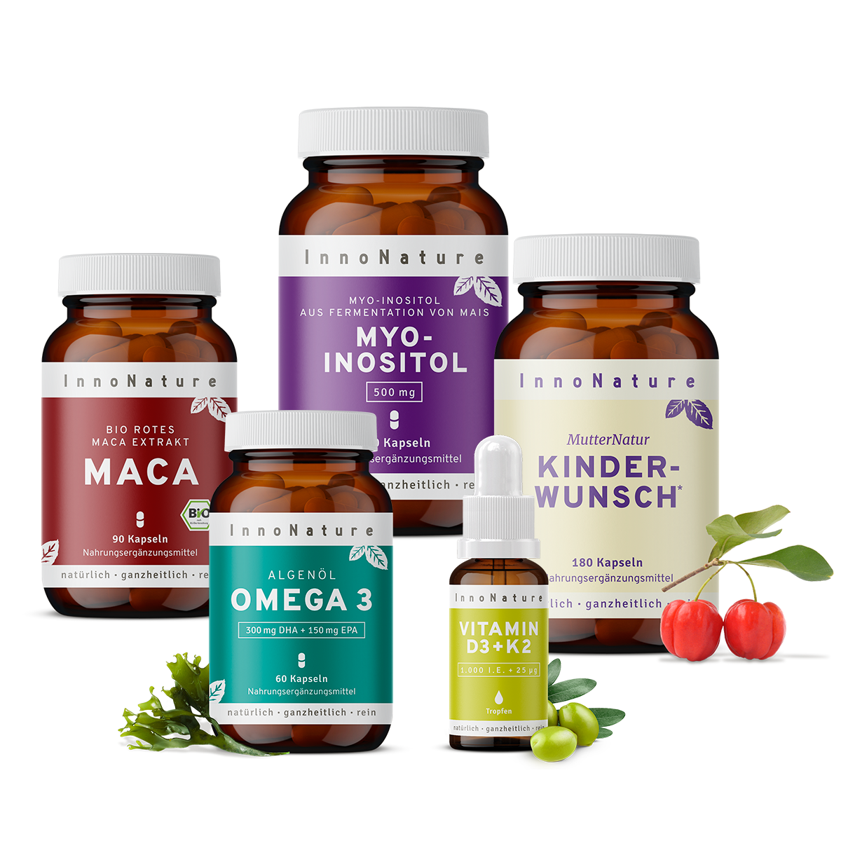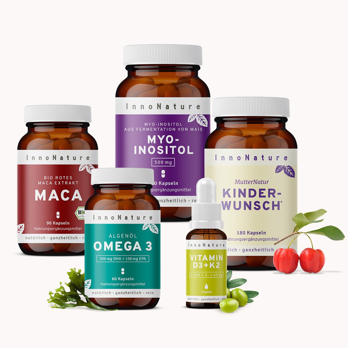 ✔ Natürliche und gezielte Unterstützung Deines Körpers mit Kinderwunsch Kapseln, Omega-3 2:1 DHA/EPA Kapseln, Vitamin D3+K2 Tropfen, Bio Rotes Maca Extrakt Kapseln sowie Myo Inositol.