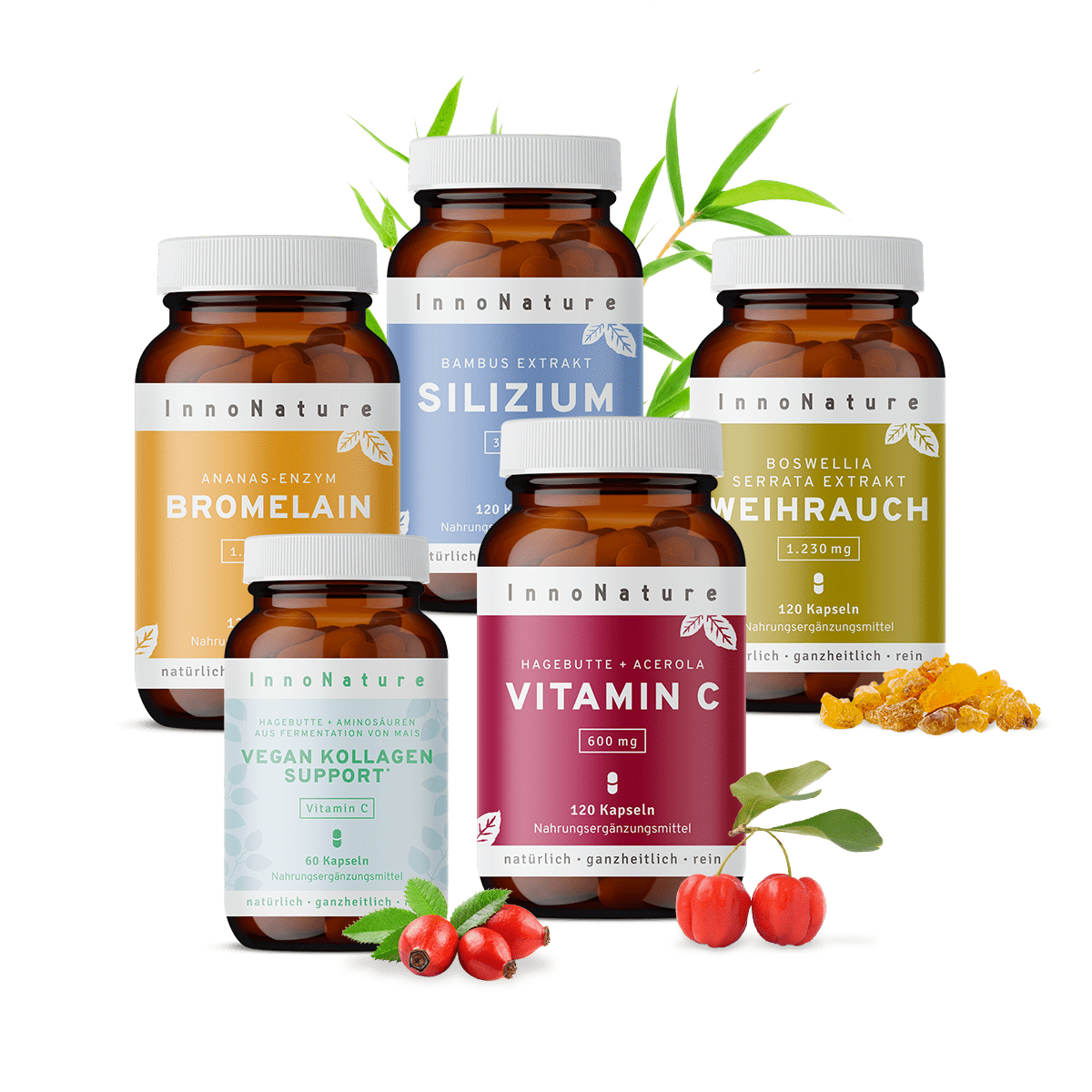 Nähere Informationen zu den Inhaltsstoffen sowie Verzehrempfehlungen der einzelnen Produkte findest Du auf den Etiketten und auf der jeweiligen Produktseite bei uns im Shop: Vegan Kollagen Support, Weihrauch, Vitamin C, Silizium und Bromelain.