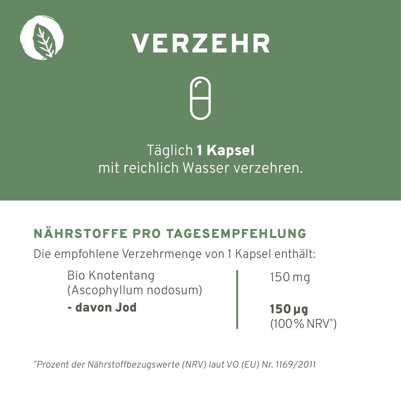 Mit der Dosierung von 150µg Jod sind die Kapseln für den Verzehr von Erwachsenen ausgelegt, da Kinder je nach Alter und Gewicht eine andere Menge Jod benötigen. Wir dürfen aus rechtlichen Gründen leider nur Dosierempfehlungen für Erwachsene geben. Im Zweifel empfehlen wir, ärztliche Rücksprache zu halten.