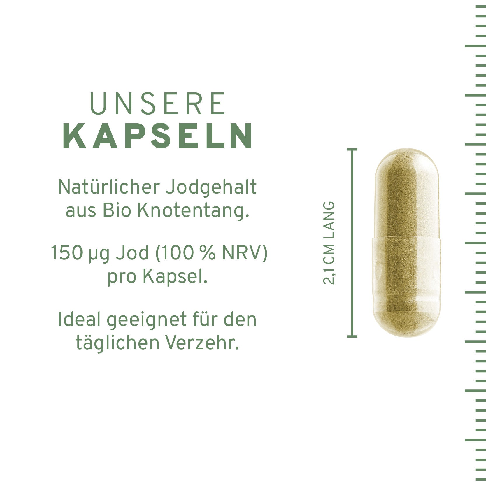 Unsere Jod Kapseln aus Knotentang sind natürlich, vegan und können aufgrund ihres natürlichen Ursprungs besonders gut von Deinem Körper aufgenommen werden.