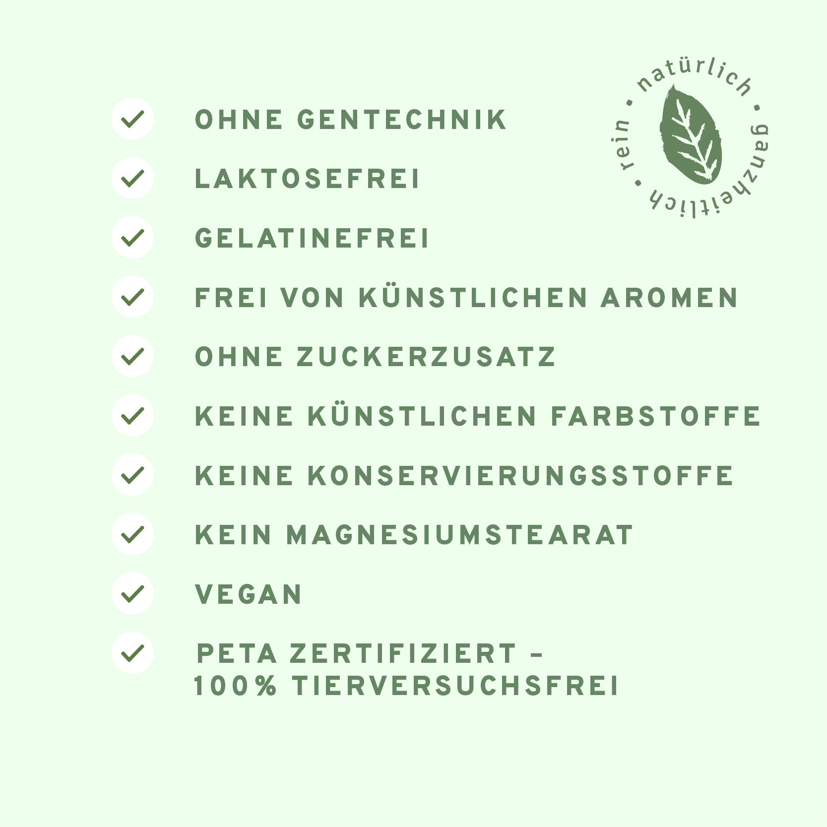 💛 NATÜRLICH, GANZHEITLICH, REIN: frei von überflüssigen Zusatzstoffen und Zutaten. Laktosefrei, ohne Zuckerzusätze, keine Farbstoffe, ohne Zusatz von Aromen, keine Konservierungsstoffe, kein Magnesiumstearat, ohne Gentechnik und allergenfrei.