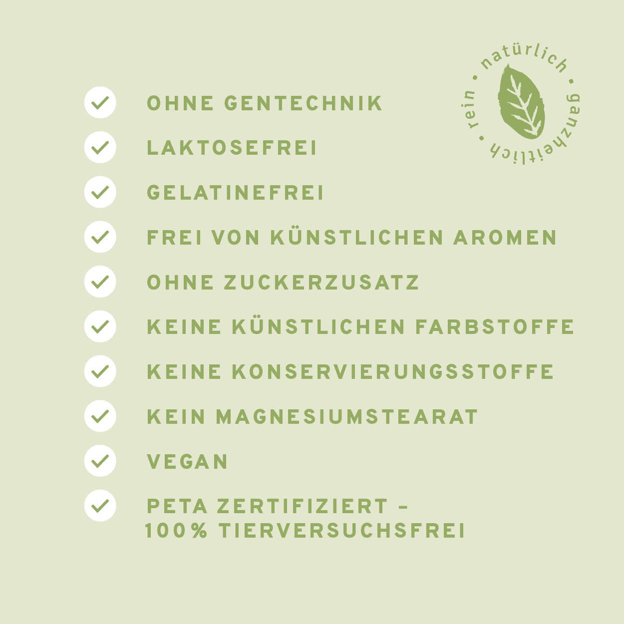 💛 NATÜRLICH, GANZHEITLICH, REIN: Frei von überflüssigen Zusatzstoffen und Zutaten. Laktosefrei, ohne Zuckerzusätze, kein Magnesiumstearat und ohne Gentechnik.