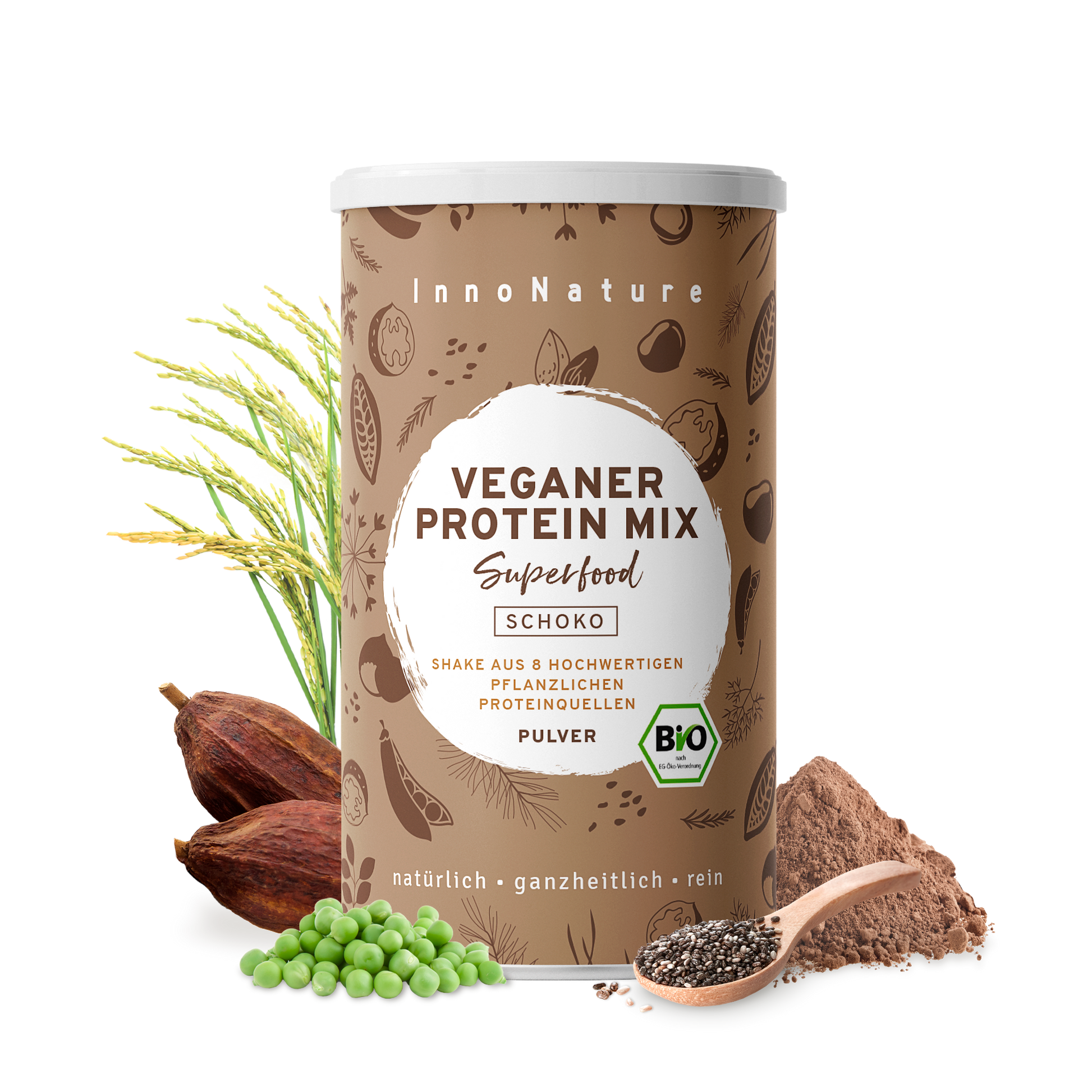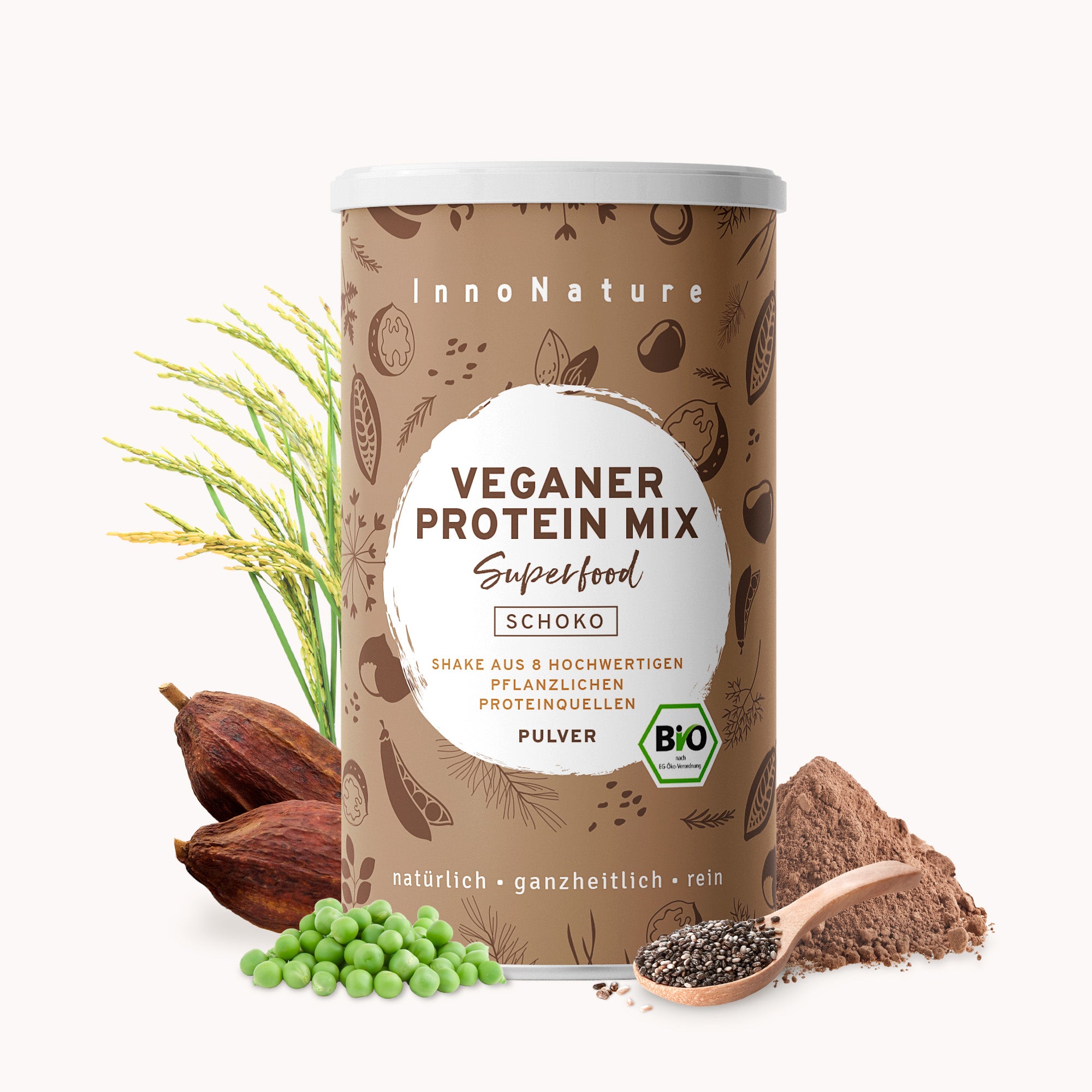 Das Protein unseres Veganen Protein Mix Schoko wird aus 8 pflanzlichen Proteinquellen gewonnen: Erbsen, Reis, Sonnenblumenkerne, Kürbiskerne, Walnüsse, Mandeln, Lein- und Chiasamen. Das Besondere daran ist, dass er nicht nur insgesamt 55 % Protein enthält, sondern Dich auch mit weiteren wertvollen Mikro- und Makronährstoffen versorgt.