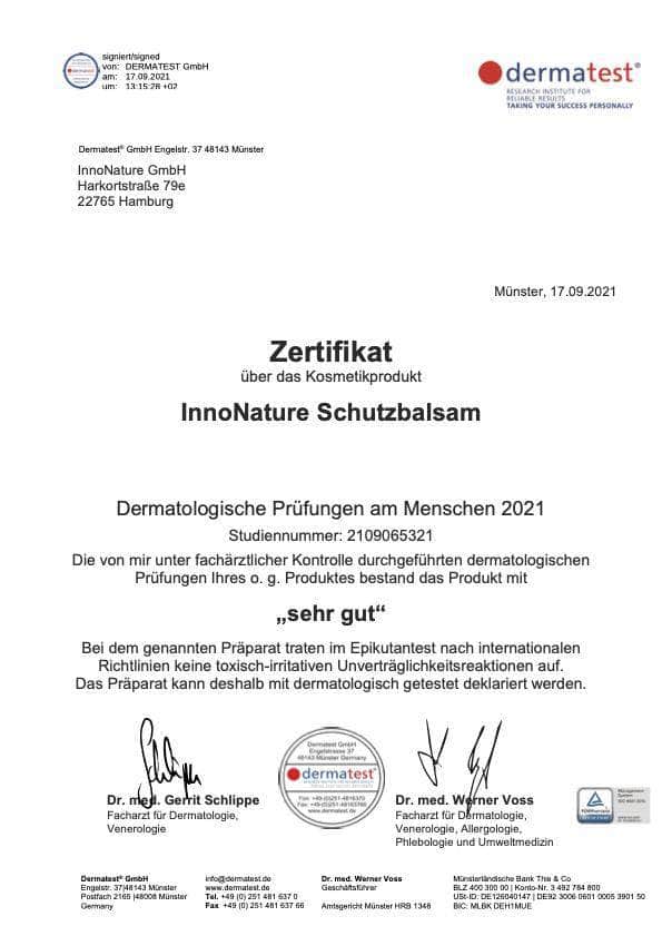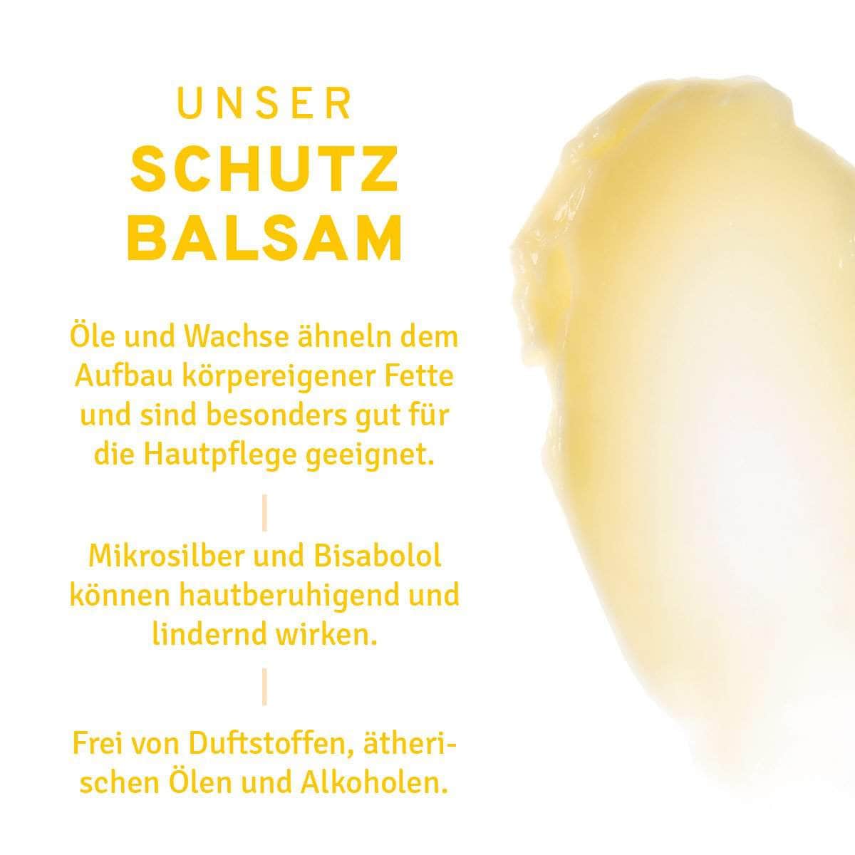 Unser Schutzbalsam ist frei von Duftstoffen, austrocknenden Alkoholen und erdölbasierten Inhaltsstoffen, weshalb er besonders gut für empfindliche Haut geeignet ist. Außerdem hat der Schutzbalsam sanft pflegende und beruhigende Eigenschaften, die insbesondere sensibler Haut zugute kommen. Die Hautverträglichkeit unseres Schutzbalsam wurde von Dermatest® mit SEHR GUT bewertet. Bei weiteren Unsicherheiten oder bestehenden Hauterkrankungen, hole Dir ärztlichen, dermatologischen oder heilpraktischen Rat ein.