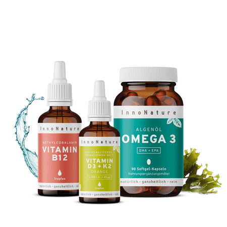 Dieses Paket beinhaltet eine hochwirksame Kombination aus Omega 3 Kapseln, Vitamin B12 Tropfen und Vitamin D3 + K2 Tropfen. Zusammen bilden sie ein unschlagbares Team für eine optimale Vitamin- und Nährstoffversorgung, vor allem bei veganer Ernährung.
