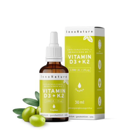 Die Vitamin D3 + K2 Tropfen von InnoNature haben eine ganzheitliche Wirkung für das Wohlbefinden und decken in der Kombination den Bedarf von Vitamin D3 und K2 ab.